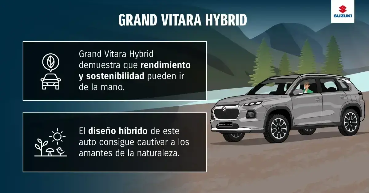 Pero su sello ecológico no es lo único que tiene para ofrecer el Grand Vitara Hybrid. La increÃble versatilidad de este vehÃculo SUV le permite trasladarse por distintos terrenos, mientras presume de su estilo atrevido y sofisticado. Además, su avanzada tecnologÃa consigue brindar excelente comodidad y control al conducir, facilitando la vivencia de experiencias memorables en hermosos paisajes.