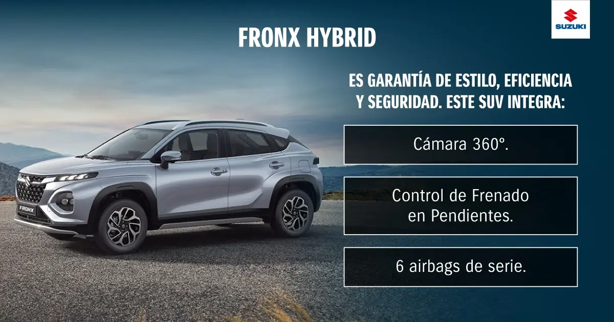 Este SUV es ideal para quienes busquen trasladarse junto a su familia en un auto eficiente por la ciudad. Su gran estilo consigue atraer múltiples miradas y el completo equipamiento que ofrece garantiza viajes muy confortables. Fronx Hybrid cuenta con Control de Frenado en Pendientes, Cámara 360°, pantalla táctil multimedia, cargador inalámbrico (versión GLX) y seis airbags de serie , entre otros componentes.