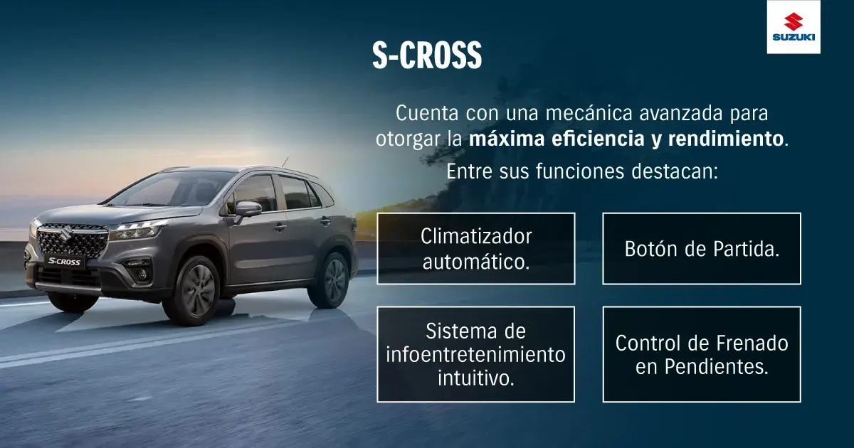 Este auto invita a la aventura gracias a su gran mecánica. S-Cross está equipado con un motor turbo en todas sus versiones, que incorpora el sistema Boosterjet, avanzada tecnologÃa de motores turboalimentados que garantizan dos prioridades para cualquier conductor: eficiencia y rendimiento . Además, algunas de sus variantes, como la GLX MT y la Limited AT también incluyen tracción 4WD y tecnologÃa All Grip con 4 modos de conducción.