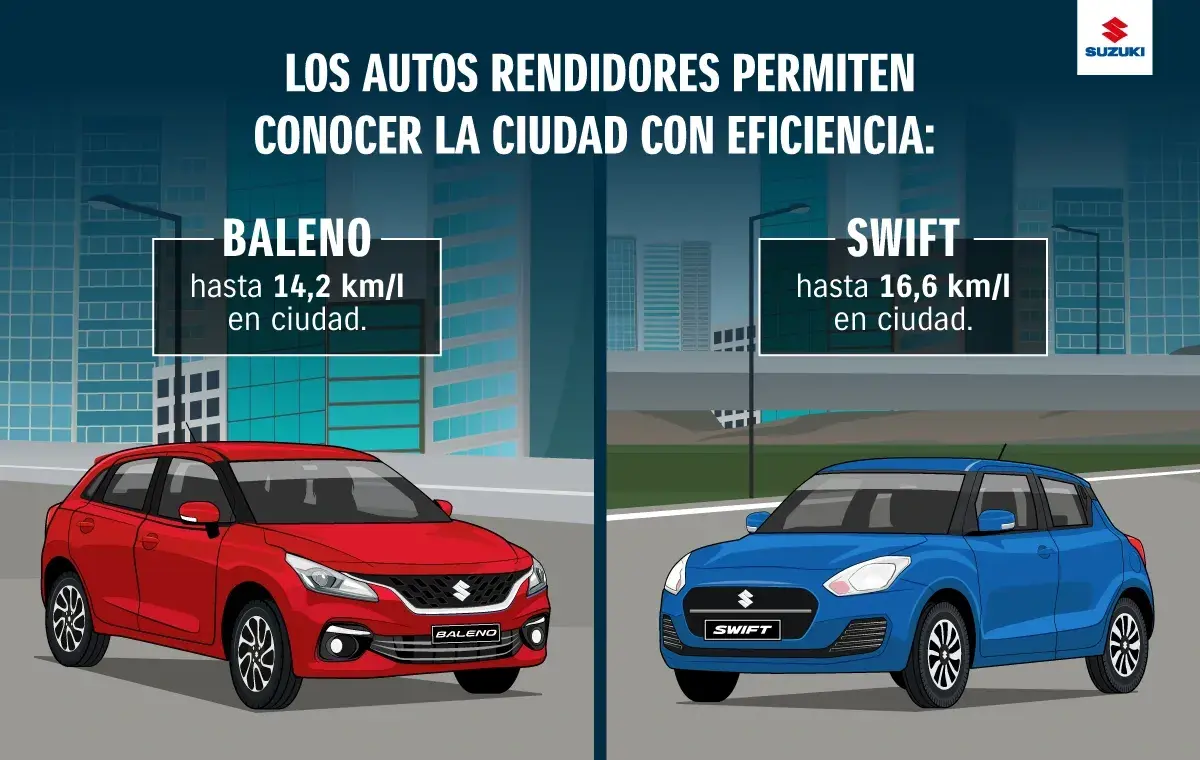El buen rendimiento del Suzuki Swift y del Suzuki Baleno los convierte en las opciones ideales para conocer nuevos lugares cada fin de semana, sin preocuparse mucho por el gasto en consumo de combustible. Es más, al ser vehÃculos urbanos enfocados en la eficiencia , es posible usarlos a diario para ir al trabajo y también los fines de semana para el entrenamiento.