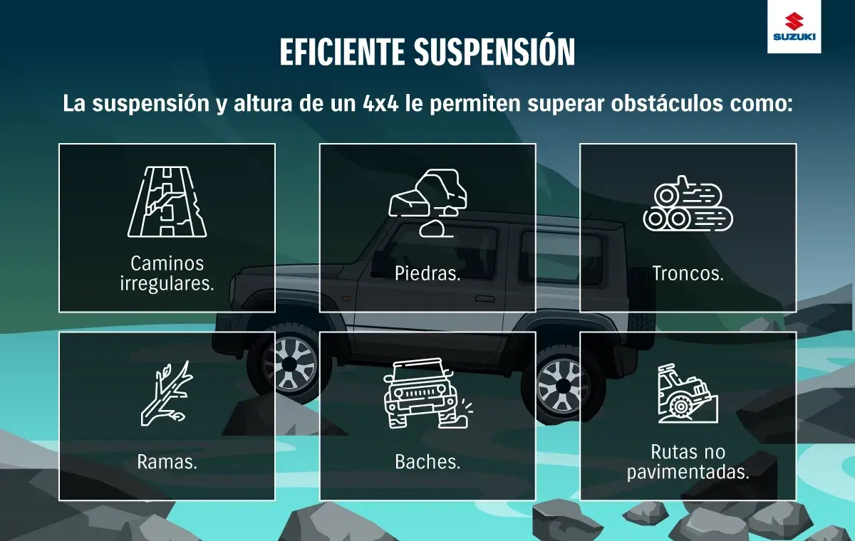 Los autos 4x4 también destacan por tener una gran suspensión. Esto les permite recorrer fácilmente caminos complejos e irregulares, absorbiendo de gran forma los impactos y las vibraciones.