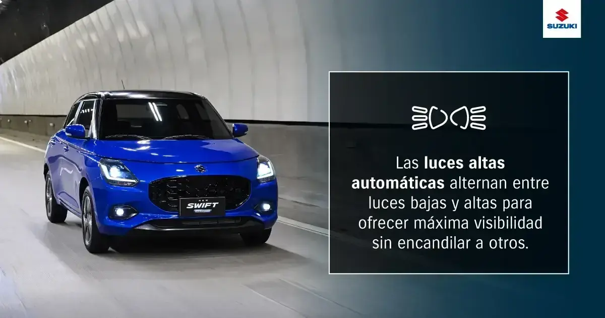 Esta función es la que cumplen las luces altas automáticas. Detectan las condiciones del entorno y la presencia de otros vehÃculos para gestionar automáticamente el cambio entre luces altas y bajas. De este modo, el Swift Hybrid ofrece una visibilidad óptima sin comprometer la visibilidad de otros conductores.