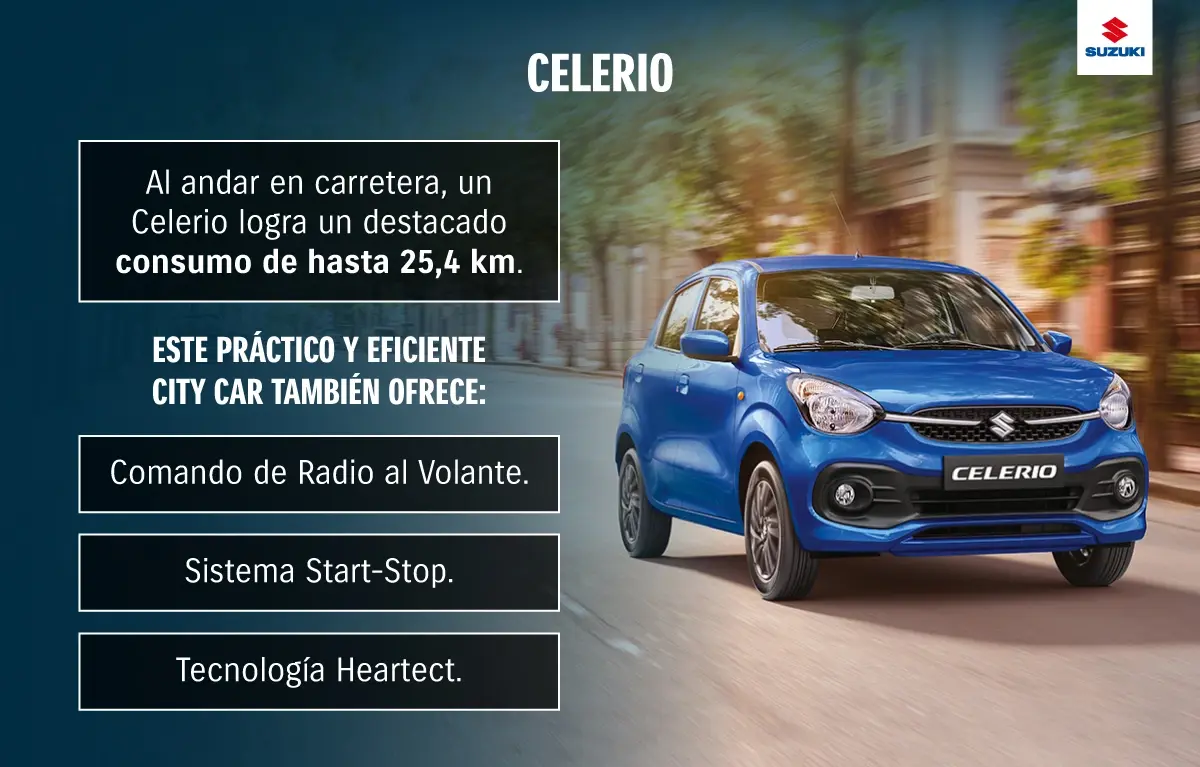 El espÃritu juvenil y atrevido de Celerio en su tercera generación es acompañado por su gran eficiencia. En su versión AMT, este modelo es capaz de ofrecer un rendimiento de hasta 21,4 km/l en la ciudad , es decir, se puede convertir en la solución ideal para quienes busquen ahorrar. En carretera, este atributo se potencia, logrando un consumo de 25,4 km/l.