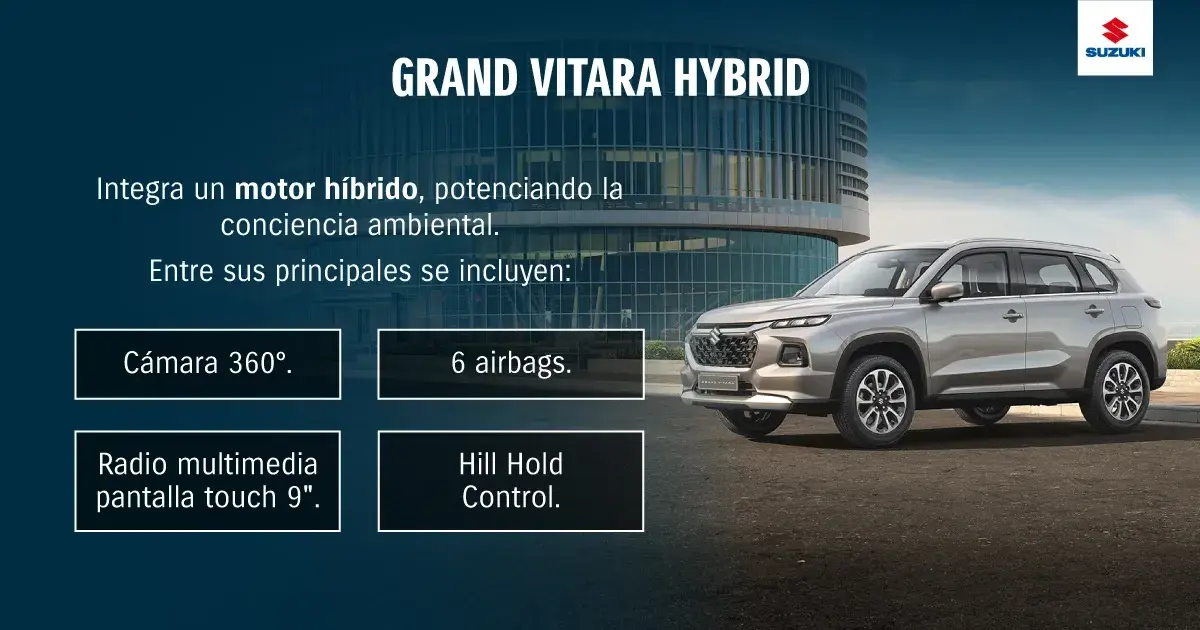 Quienes hayan hecho de la sostenibilidad y el cuidado del planeta una forma de vida, pueden potenciar su conciencia medioambiental con Grand Vitara Hybrid . Este moderno y elegante auto integra un motor hÃbrido , es decir, se impulsa a través de combustible y electricidad. También cuenta con una tracción 4WD y tecnologÃa All Grip en su versión Limited at 4x4 .